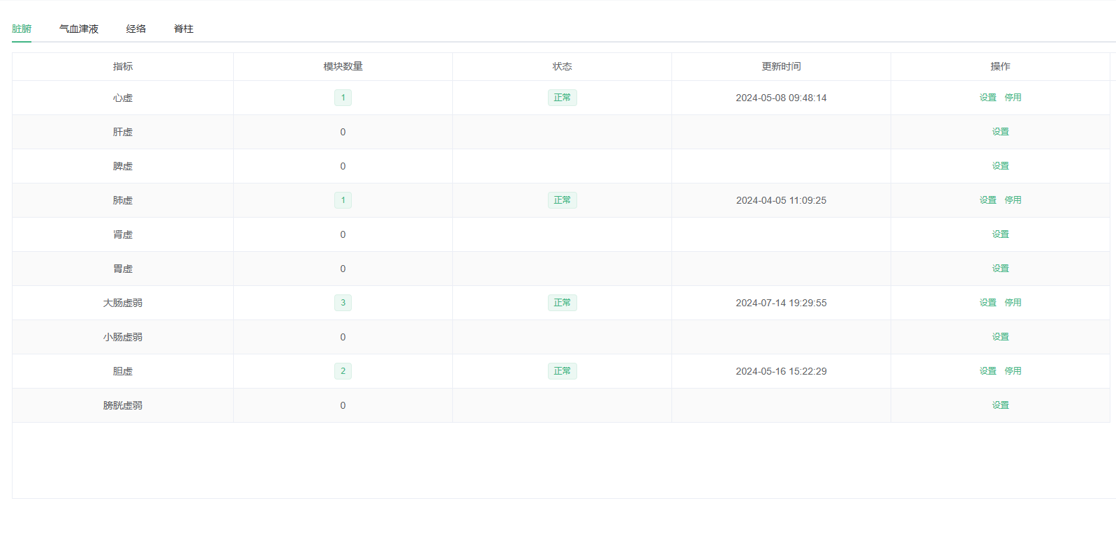 提供脏腑10项、气血津液10项、经络14项目、脊柱30项,总共64项指标的调理方案创建